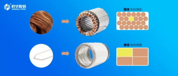 在此背景下,扁线电机应运而生,PEEK以其独特的优势迅速成为驱动电机的优选材料。PEEK扁线具备高槽满率、结构紧凑、韧性优异、耐弯折以及出色的电性能和耐溶剂性,这些特性使其能够轻松应对高压环境下的各种挑战。