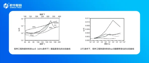 PEEK5600FG25的介电常数只有3.0,略高于PE(聚乙烯)和氣塑料,但比PVC(聚氣乙烯)低很多。下图的比较曲线显示,在109Hz的频率范围内,普通PEEK聚合物具有良好的电气性能,该材料的很多电气性能符合热塑材料的典型性能,同时PEEK聚合物在极广的温度和频率范围内也保持这些优良的绝缘性能。从图中可以看出,PEEK材料在140℃以下,其tanδ损耗较小。